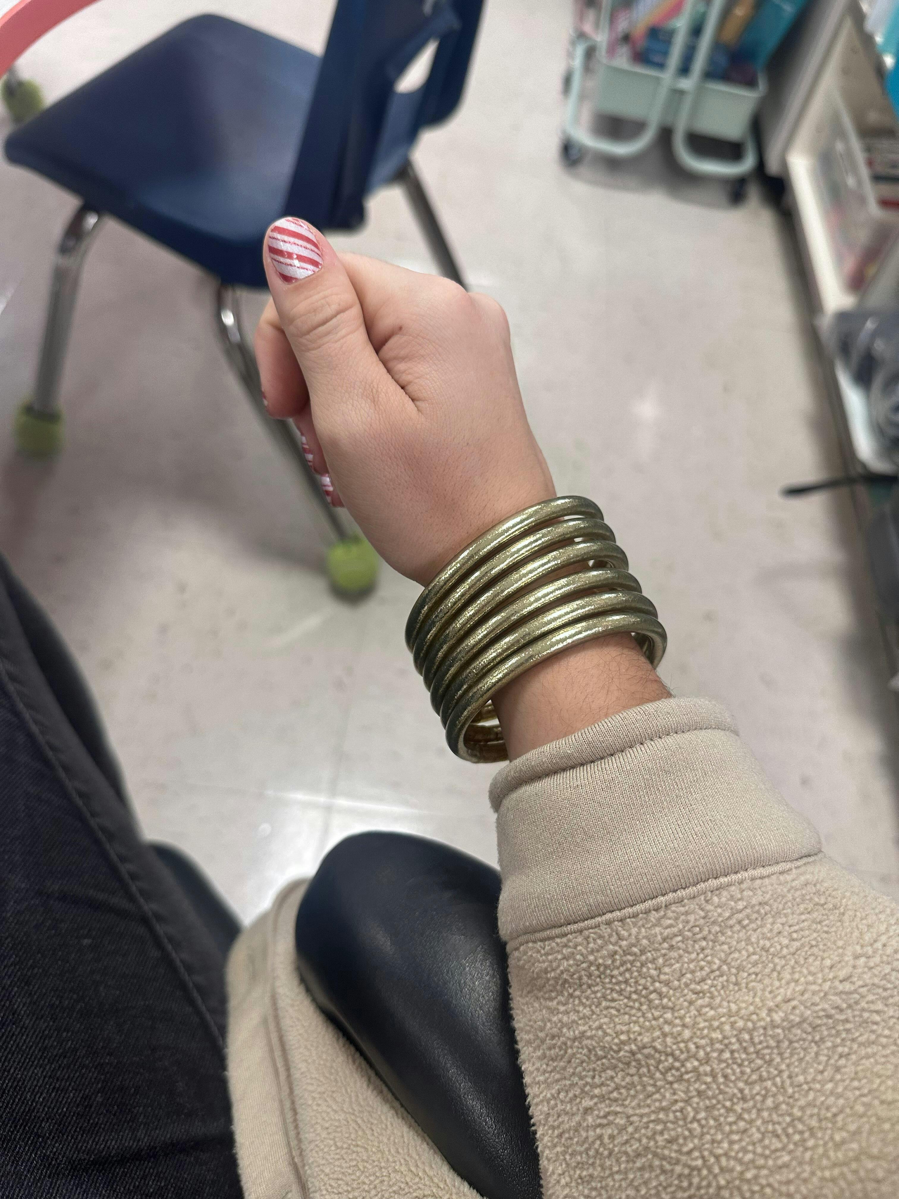 The bangles can be compromised by certain products like self-tanners or fixatives that change the color of the plastic. If fragrances or creams are in contact with the bangles, we suggest a quick rinse.