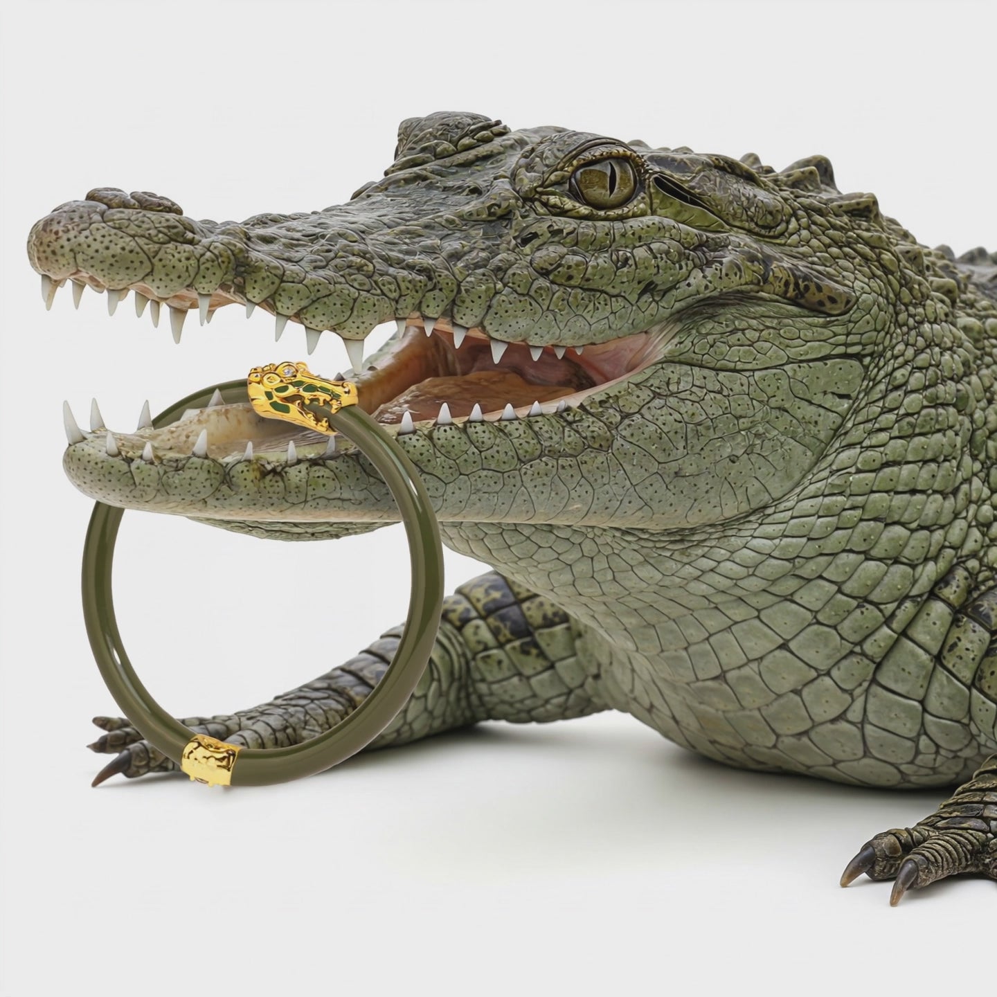 Crafted with meticulous precision by our artisans in Bangkok, Thailand, this extraordinary bangle features exquisite jade tubing that flows seamlessly into a striking crocodile head. The head, adorned with shimmering clear crystals and hand-finished with lustrous jade enamel, captures the crocodile’s timeless elegance and primal energy. A perfect addition to a refined wardrobe, this bangle blends natural beauty and expert craftsmanship to create a piece as powerful and adaptable as the creature it honors.