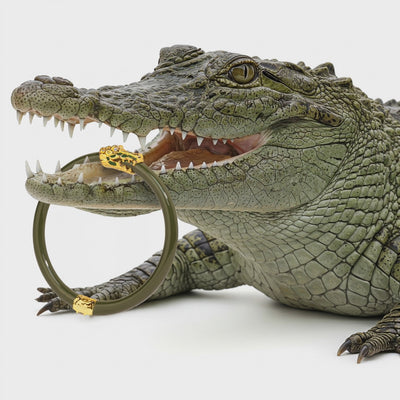 Mindful Glamour Ritual: Pause. Breathe. As you place the Fauna Crocodile Bangle onto your wrist, feel its smooth jade surface and the powerful presence of the crocodile. Close your eyes and envision the crocodile, gliding effortlessly through water, a symbol of adaptability and strength. With each inhale, draw in its resourcefulness and calm determination; with each exhale, let go of doubt and embrace your ability to thrive in any situation.