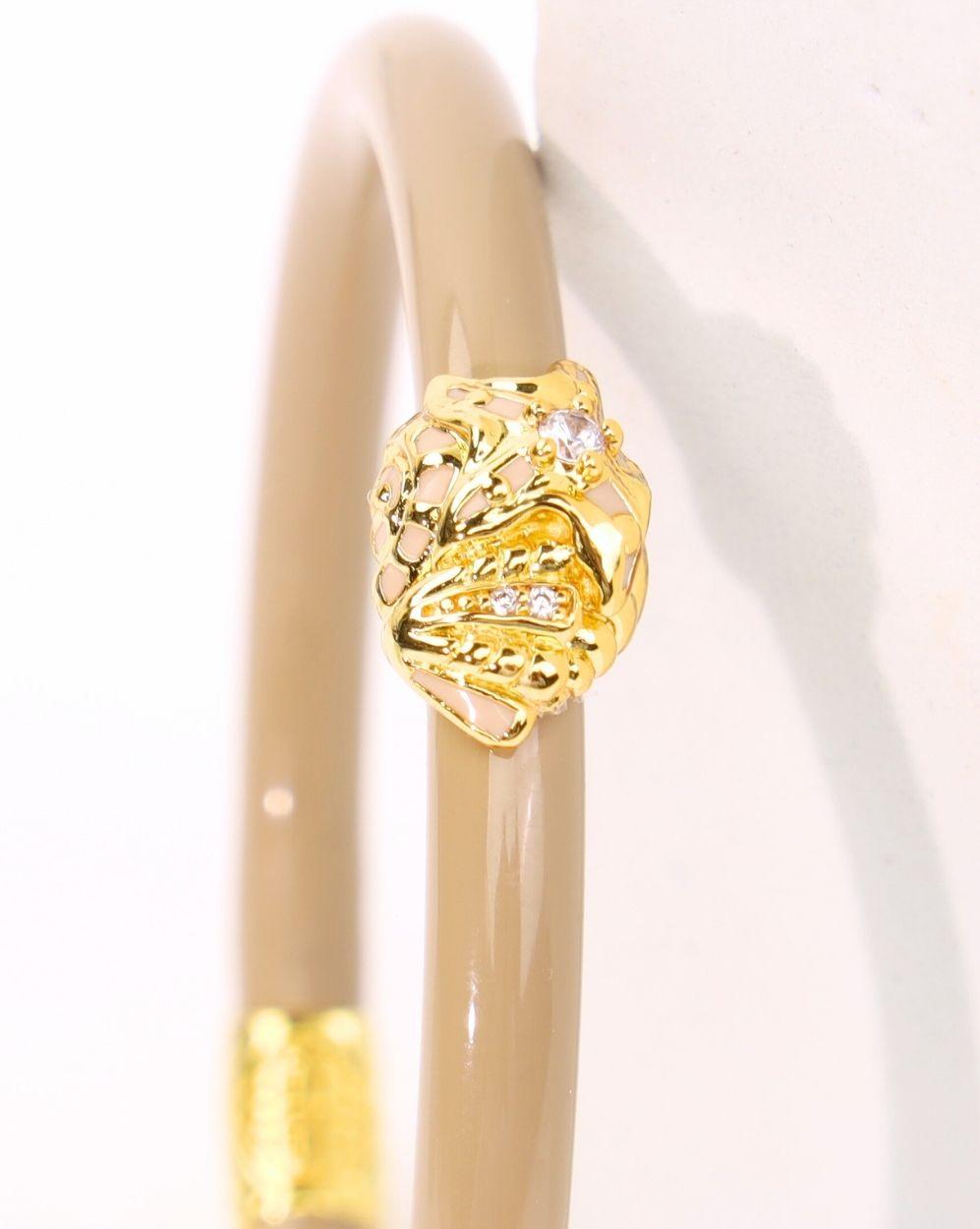 - Shell crafted from gold-plated brass, adorned with shimmering clear crystals, and finished with a lustrous Sand enamel