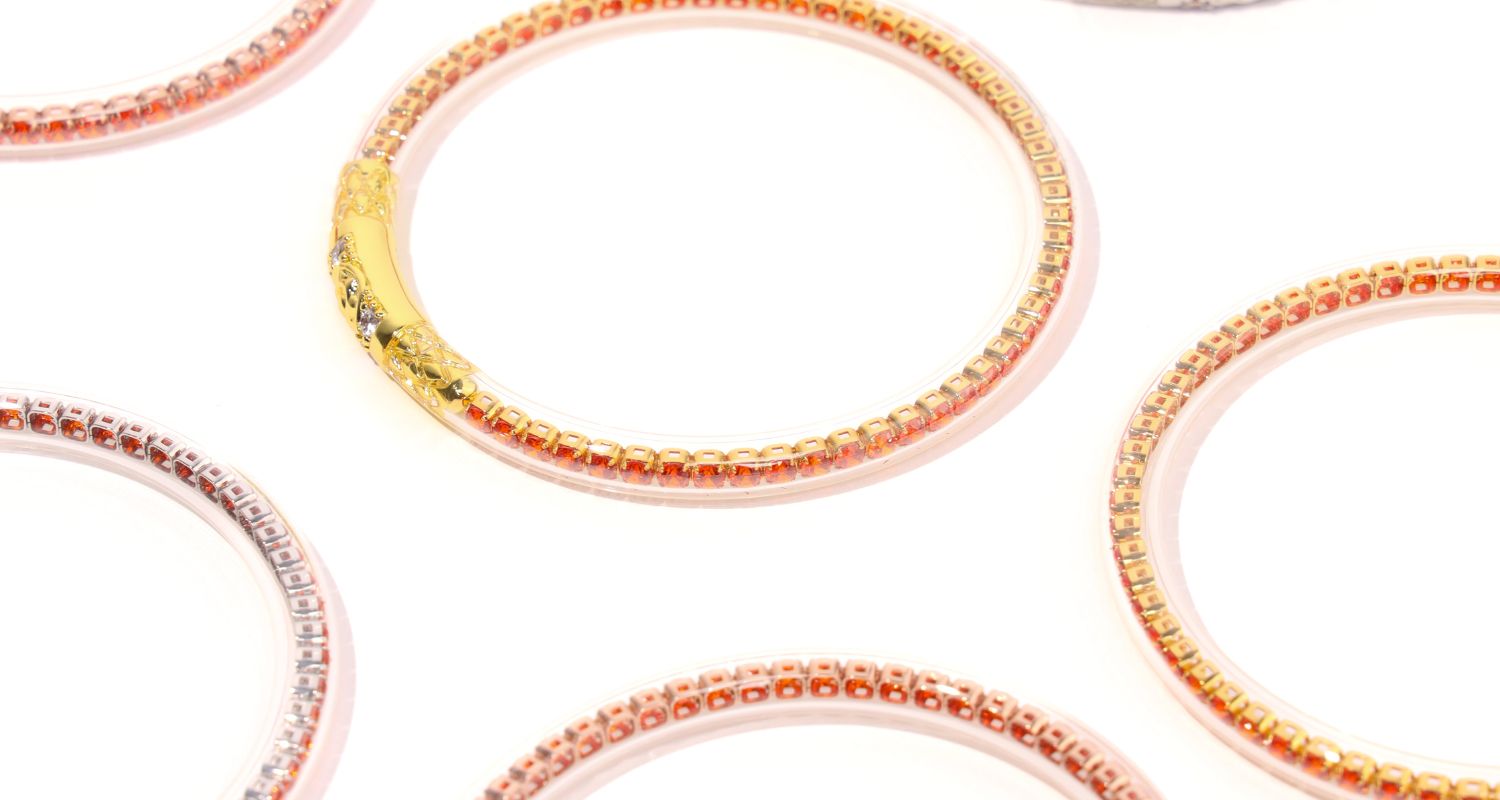 The most beautiful shade of lustrous orange is ensconced in our crystal-clear tubing, sealed with our signature Three Queens bead in gold to capture the sun, in white gold to capture the moon, and in rose gold to capture dawn.