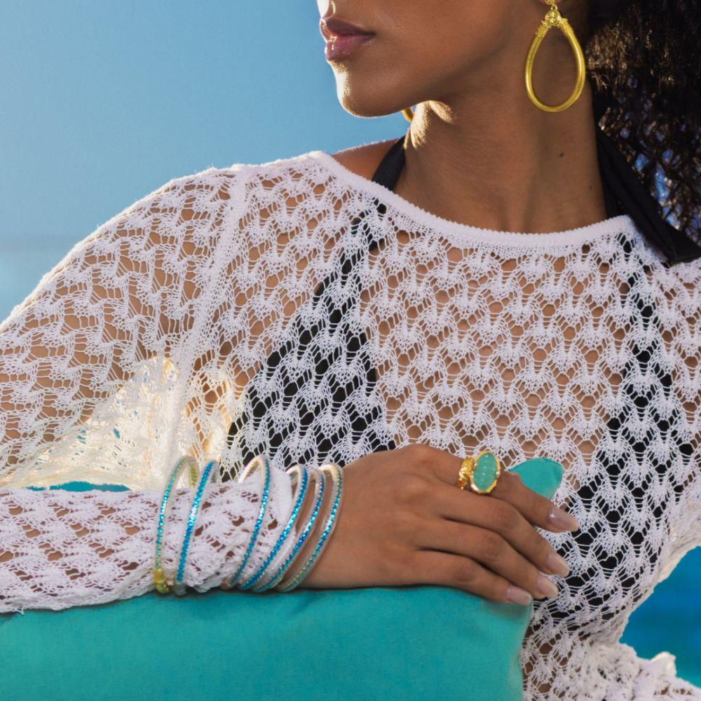 AquaAqua Three Queens All Weather Bangles are a refreshing embrace of light, clarity, and fluid beauty. In the most translucent clear tubing reside radiant aqua crystals—each one capturing the essence of sunlit seafoam and crystalline ocean waters. These bangles shimmer like waves caught in motion, offering a cool, calming presence on your wrist.